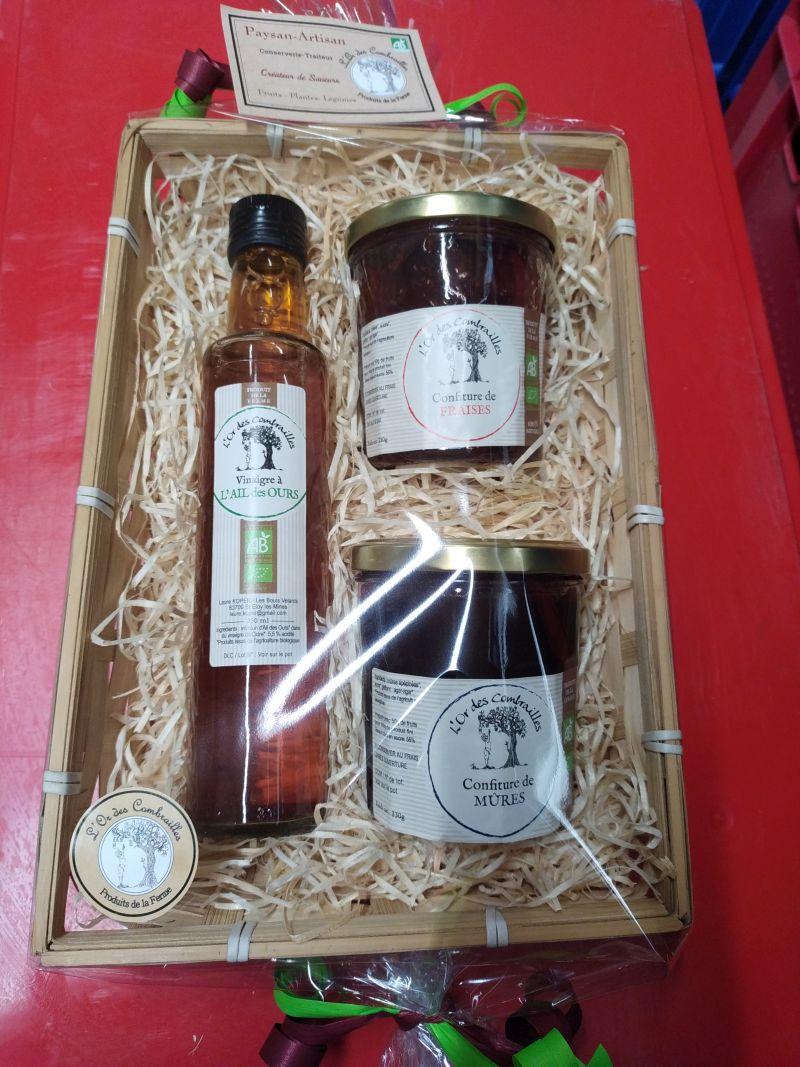 Jolie panière en bambou contenant 1 vinaigre à l'ail des ours , 1 confiture de mûres et 1 confiture de fraises